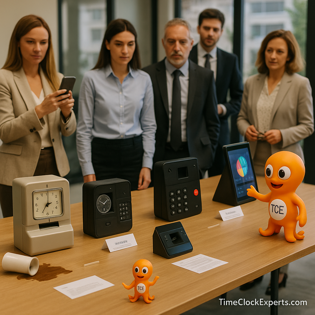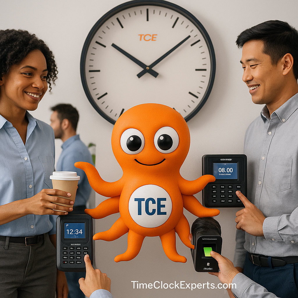 Clocktopus helping employees use biometric time clocks in modern workplace with Acroprint and Compumatic fingerprint scanners under large TCE wall clock